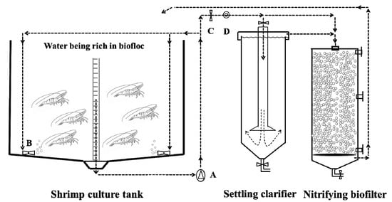 In recent years, biofloc technology (BFT), as a new in situ water treatment technology, has demonstrated great potential in the maintenance of water quality (especially for the removal of ammonia) for shrimp culture [,,]. In intensive feeding systems, the biofloc can naturally form from active microorganisms and accumulated organic materials and then suspend in the culture water to act as tiny biofilters in an extremely large number []. The biofloc can remove ammonia by both the nitrification of chemoautotrophic bacteria and the assimilation of heterotrophic bacteria, which process dominates depends on water condition and applied management [,,]. However, under zero water exchange conditions, an increasing amount of biofloc will produce in the culture water, resulting in not only a raise of water respiration rate and decline of dissolved oxygen but also environmental stress to cultured shrimp [,,]. Moreover, large fluctuations of water quality indicators (such as ammonia, nitrite, etc.) may happen because of excess bioflocs or suspended solids accumulating in the system [,]. Previous studies have suggested that controlling moderate concentrations of biofloc benefit water quality and shrimp performance in BFT systems [,,].