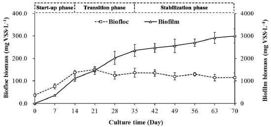 Similar to the sound practice of biofloc-based shrimp culture systems reported in other studies, a 10% volume of biofloc-enriched water was inoculated into culture water to accelerate the development of biofloc in the shrimp culture tank of each system [,]. The development of biofloc and biofilm in terms of VSS is shown in Figure 2, which corresponded to the continuous input of the feed and regular operation of the system. The VSS of biofloc increased with continuous input of feed nutrients and dense proliferation of various microorganisms during the start-up and transition phases [,] and then was maintained at relatively low levels during the stabilization phase by joint operations of clarifier and biofilter. Meanwhile, biofloc-rich water from shrimp culture tanks continuously in-flowed into the biofilter by the adjustment of water flow rate at different phases, and the trapped biofloc together with organic substrates accelerated the formation and development of nitrifying biofilm attached to moving bio-media [,]. The VSS of biofilm increased gradually from zero at the initial stage to 2998 mg L‒1 at the end of the trial, indicating the fast and good formation of nitrifying biofilm in the biofilter.
