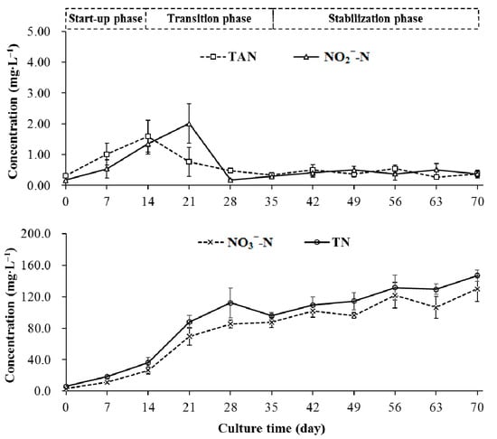 Along with biofloc development in shrimp culture tanks and biofilm formation in nitrifying biofilters in the trial, the changes of TAN, NO2−-N, NO3−-N, and TN concentrations over the 70-day trial are shown in Figure 3. These nitrogen dynamics indicated that nitrification could be instantly started up and performed stably for ammonia removal during the running of the system in this study [,]. It is certain that nitrifying microorganisms in the inoculated biofloc-rich water acted as nitrifying seeding and accelerated the start-up and establishment of total nitrification mediated by biofloc and biofilm in the system [,,]. Certainly, a short-term time lag was still observed in the establishment of nitrification, as indicated by the slight increases in TAN and NO2−-N concentrations during the start-up and transition phases in the trial. On the one hand, the nitrifying microorganisms associated with biofloc needed two to three weeks to grow to sufficient quantities in order to cope with the increased production of ammonia. As observed in the trial, not only the biofloc level (in terms of VSS) but also the nitrifying microbial abundance significantly increased from the start-up phase to the transition phase. On the other hand, the newly started biofilter also needed a certain time to acclimate to the biofloc-rich water [], especially for that the growth condition of nitrifying microorganisms transferred from biofloc suspension to biofilm attachment. The nitrifying biofilm gradually formed and attached to the blank biomedia in the biofilter, as observed in the trial. Nonetheless, the peaks of both TAN and NO2−-N were within the safe ranges for L. vannamei culture [,], and then their concentrations decreased quickly in one to two weeks, remaining at stably low levels. As for the industrial practice, the inoculation and acclimatization method in this study could be a good choice for shrimp farmers to start a hybrid biofloc-RAS, in particular, to cope with slow-growing nitrifying microorganisms and a highly time-consuming process []. Moreover, relatively fast and stable nitrification could be achieved in the hybrid biofloc-RAS resulting from the combined effects of biofloc and biofilm, even under the conditions of high feeding rates and zero water exchange for shrimp intensive culture.
