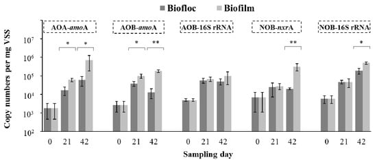Abundance comparison of nitrifying microbial communities based on qPCR of 16S rRNA and functional genes between biofloc and biofilm from the biofloc-RAS for shrimp intensive culture in a 70-day trial (mean ± S.D., N = 3; * p < 0.05; ** p < 0.01). AOA-amoA represents ammonia-oxidizing archaea based on the archaeal amoA gene, AOB-amoA represents ammonia-oxidizing bacteria based on bacterial amoA gene, AOB-16S rRNA represents ammonia-oxidizing bacteria based on 16S rRNA gene, NOB-nxrA represents nitrite-oxidizing bacteria based on nxrA gene, NOB-16S rRNA represents nitrite-oxidizing bacteria based on 16S rRNA gene.
