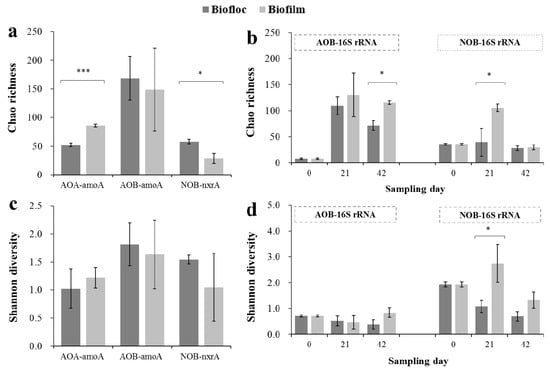 Alpha-diversity comparison of nitrifying microbial communities based on Miseq sequencing of 16S rRNA and functional genes between biofloc and biofilm from the hybrid biofloc-RAS for shrimp intensive culture in a 70-day trial (mean ± S.D., N = 3; * p < 0.05; *** p < 0.001). (a) Chao richness of AOA-amoA, AOB-amoA and NOB-nxrA at day 42; (b) Chao richness of AOB-16S rRNA and NOB-16S rRNA at day 0, 21 and 42; (c) Shannon diversity of AOA-amoA, AOB-amoA and NOB-nxrA at day 42; (d) Shannon diversity of AOB-16S rRNA and NOB-16S rRNA at day 0, 21 and 42.