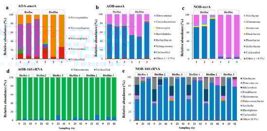 Genus-level composition of nitrifying microbial communities based on Miseq sequencing of 16S rRNA and functional genes in biofloc and biofilm from the biofloc-RAS for shrimp intensive culture in a 70-day trial. (a) Relative abundance of AOA-amoA at day 42; (b) Relative abundance of AOB-amoA at day 42; (c) Relative abundance of NOB-nxrA at day 42; (d) Relative abundance of AOB-16S rRNA at day 0, 21 and 42; (e) Relative abundance of NOB-16S rRNA at day 0, 21 and 42.