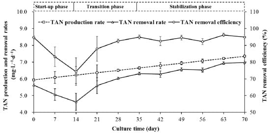 The TAN removal rate (RRTAN; mg·L−1·d−1) and TAN removal efficiency (RETAN; %) were estimated using following equations: