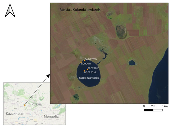 The endorheic Maloye (in some transcriptions Maloe) Yarovoe lake (53°04′ N, 79°05′ E, 95 m.a.s.l.) is located in the Kulunda depression on a territory of Western Siberia (Russia). This territory is distinguished by high variety of saline lakes of diverse chemical composition [27,28,29]. The lake has the area of 35 km2 and the maximum depth of 5 m (Figure 1) with steep banks and Scirpus hippolytii Krecz. and S. tabernaemontani C.C. Gmel. [30] behind the cliffs. The mud of the lake is used for medicinal purposes by the Znamenskaya Hospital opened in 1991. The lake is highly popular for camping tourism during summer period (50–100 people daily in June–August).