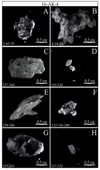 To study the morphology and composition of individual grains using an electron scanning microscope, the most interesting grains were selected from samples of bottom sediments and glued to carbon tape. The prepared samples were viewed on a TESCAN MIRA3 LMU scanning electron microscope (TESCAN, Brno, Czech Republic) with an Inca-Energy dispersive attachment for quantitative analysis (laboratory of X-ray spectral analysis of the IGM SB RAS, Oxford Instruments, Moscow, Russia). The crystals photographs were taken at the Center for Collective Use of the Institute of Cytology and Genetics SB RAS using a Stemi 2000 CS microscope with an AxioCam HRc digital camera (Carl Zeiss LLC, Novosibirsk, Russia).