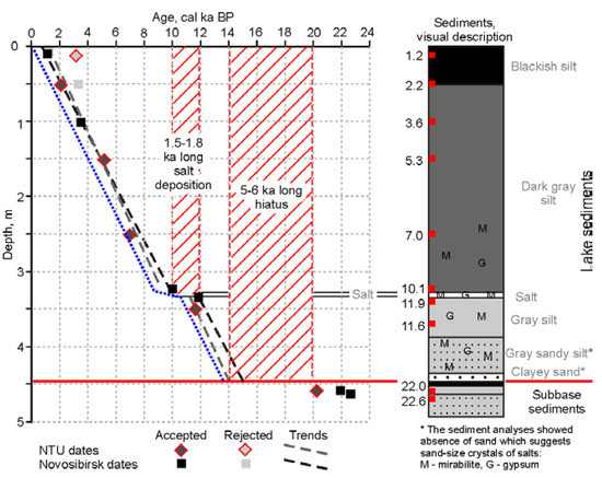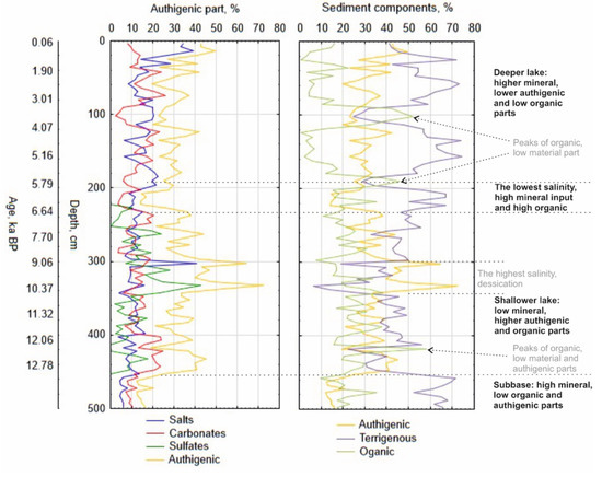 The obtained dates suggest continuous sedimentation for the section above the salt layer, which lasted about 10 ka BP (Figure 4). A 5 cm thick salt layer reflects 0.09 ka BP long precipitation (10.10–10.19 ka BP). The extrapolation of dates below the salt layer suggests that the age of the lake subbase is 12.9 ka BP. Other significant changes in the state of the lake occurred at about 6.5–7.1 ka BP at a depth of 225–250 cm (transition from a small lake to a large one with intensified coastal erosion), about 5.69 and 3.5 ka BP at depths of 190 and 100 cm, respectively (increase in the organic component).