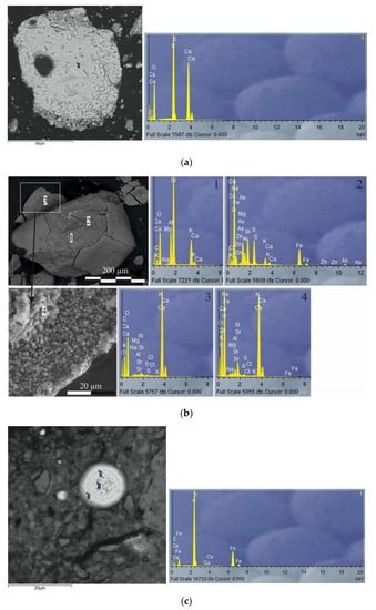 The upper half of the sediments united in the section 3 illustrates an increase in the shoreline erosion and corresponds to a “deep lake” stage. Clastic compound of mineral assemblages repeats the terrestrial clay material composition that is specified by the predominance of mica–hydromica and chlorites with the minimal amount of smectic phase [48]. As can be seen from Figure 5, the entire section 3 is sulfates-less. At the same time, there are peaks of a sharp increase in the organic content at the depths 1.0 and 1.9 m that can be indicated as a reflect to temporary changes in the state of lake ecosystem. The lowest salinity of the lake is at the section 3a (1.6–2.25 m/5.2–6.4 ka BP) with high quantity of terrigenous material (mainly quartz and such aluminosilicate minerals as chlorites, K-fields) and less amount of organic and chemical components. Evaporites are represented by carbonates (mainly in form of calcite) and halite. The upper section 3b (0–1.6 m/0–5.2 ka BP) is a muddy layer with the lowest amount of organic compound (13%). Mineral composition is represented by high amount of clastic compound (feldspars, quartz), with lesser proportions of halite and low-magnesium calcite (LMg-calcite). The traces of dolomite and hematite were also detected. Figure 7b illustrates the feldspar grain located inside the “shell” consisting of calcium carbonate crystals.