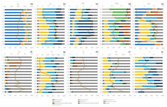 Vertical profiles (cm) of elements (in %) extracted in the sequential extraction. The line represents element concentration is in mg/kg units (Na–(a), Ca–(b), Mg–(c), SiO2–(d), SO3–(e), Cu–(f), Sr–(g), Fe–(h), Ba–(i), U–(j).