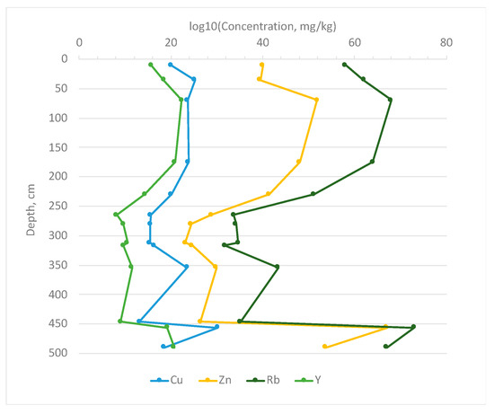 Trace elements (Cu, Zn, Rb, Y, Pb) distribution along the sediments (mg/kg).