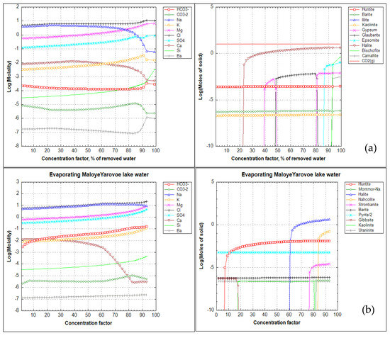 According to the modelling results, the chemical composition of Maloye Yarovoye Lake does not undergo significant changes during evaporation of up to 80% of water (Figure 11a). Since the initial solution with salinity of 220 g/L (Cl-Na chemical type) is already in equilibrium state with respect to barite, quartz, kaolinite, magnesite-dolomite-huntite (Table S9), it can be suggested that up to nowadays evaporation pattern of the solution in the lake has been quite similar to the empirical observations for evaporation of seawater until halite precipitation [43]. At the last stages, epsomite and bischofite/carnalite could precipitate (Figure 11b, >80% of evaporation). Described evolution pattern is similar to the evaporation of seawater brines with some changes [57].