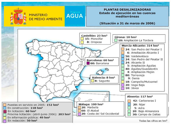- SPAINBUSINESS. La Desalinización en España Cuadernos Sectoriales. Enero de 2007; Ciclo del agua, 2; ICEX: Madrid, Spain, 2007. [Google Scholar]