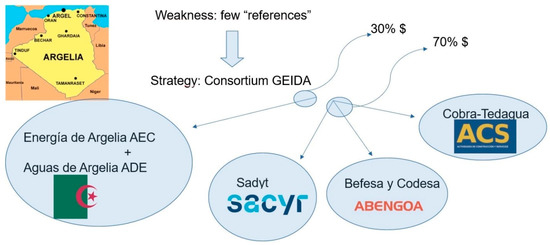Sadyt is a limited company with its head office in the Paseo de La Castellana in Madrid. The company was founded on 15 February 1995. To date, Sadyt has not been listed on the stock exchange. The company is engaged in the purification and treatment of drinking and waste water. Until 2008 (the final year in the period analyzed in this study), the company had two shareholders and 19 holdings. (In 2008, the company’s board of directors was composed of Jose Antonio Sánchez Vega (Chairman, Antonio Dorado (Managing Director), Jose Carlos Rubio (Director of National Development), Juan Pablo Batanero (Director of International Development), Carlos Madrid (Director of National Production), Vidal Martín (Director of International Production), Domingo Zarzo (Technical and R&D&I Director), and Almudena Rodríguez (Administrative-Financial Director).) Currently (2019), the chairman is Pablo Abril-Martorell Hernández, the Managing Director is José Antonio Membiela and the Administration Director is Inmaculada Martínez Álvarez. In 1996, the company began to work with ten employees. The workforce remained at this level until the year 2002 when it had fifteen workers. After this date it began to grow exponentially, with 28 employees in 2003 and 89 in 2006. Sadyt’s debt ratio was 86% points in 1995. This figure diminished until it dropped to its minimum point in 1999 with 66.30% points, and subsequently it rose until the year 2006 when a debt ratio of 99.31% was reached. (Due to the type of activity developed by Sadyt, some years it has a positive result and others a negative result because of the large investments that it makes. However, the company is continuously growing and has to make large investments each time it constructs a plant.) Its operating income amounted to almost four million euros in 1995 and in 2006 this figure was close to 36 million euros. (Source: Spanish Institute for Foreign Trade (ICEX)). The Spanish company Sadyt began an important internationalization process, making an appropriate use of its competitive advantages. When the company has encountered weaknesses, it has known how to minimize them with strategies such as collaborating with other companies [16,17]; for example, when it created a consortium called GEIDA formed by Sadyt, Cobra, and Befesa. The GEIDA consortium, which can be seen in Figure 3, took part in (and won) the tender for the operating of a Treatment Plant in Macao for which it also collaborated with AGS Macao. In 2006 and 2007, the international expansion of Sadyt represented 39% and 58% respectively of the total turnover for those years, with an international portfolio of 556 million euros with respect to the total portfolio of 663 (Source: ICEX). In 2004, the GEIDA consortium, made up of Befesa and Codesa, both owned by Abengoa; Cobra-Tedagua of ACS; and Sadyt of Sacyr Vallehermoso was awarded with the contract for constructing and exploiting two desalination plants in Algeria in Skikda and Beni Saf for 25 years (under concession). Additionally, in Algeria, specifically in Oran, GEIDA has won the contract to design, construct, and operate a desalination plant with a capacity of 150,000 cubic meters per day, which will supply 750,000 inhabitants. The budget for this facility is 130 million dollars (GEIDA is a consortium of which Sadyt forms a part). In this project, the consortium collaborated with two Algerian companies, the Algerian energy company AEC and the Algerian water company ADE GEIDA contributed 70% of the capital of the concessionary company, AEC and ADE contributed the remaining 30%.