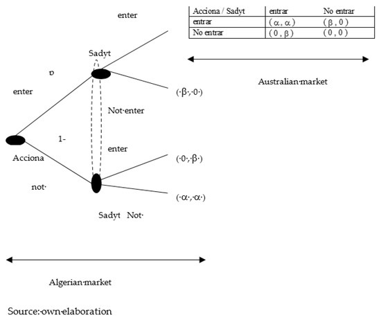 On the other hand, the theory that maybe best explains the internationalization process of companies such as Sadyt is the theory of oligopoly behavior [32]. The theory of oligopoly behavior is perhaps that which best explains the FDI carried out by Sadyt and its competitors. As this theory indicates, companies that construct and exploit desalination plants make up a small group, within which each has a relative position in the market. (In this respect, when business opportunities arise in Australia, Tunisia, or Algeria, among others, all the companies that form this oligopoly compete to win the contracts.) The fact that the desalination companies form an oligopoly is justified by the large investment costs that have to be made to construct a plant. These costs are difficult to bear for a new company. (If Sadyt had not participated when the business opportunities had arisen in Algeria, it would have lost an important part of its market. This, most probably, would have given rise to a defeat in the tender in Australia where they were currently finalists, as one of the principal factors that has been taken into account in this tender is previous accumulated experience.) The theory of oligopoly behavior distinguishes between two cases. The first is when the product offered is differentiated and the second case is when there is no product differentiation. The product offered by Sadyt and its competitors is not really a differentiated product. The final product offered by them all is the same, desalinated water; the processes to obtain it and the technologies are also the same; inverse osmosis; however, each company designs a project with slight differences regarding issues such as the way in which the pouring is carried out or the basic components but it cannot be considered as product differentiation. When the oligopoly is formed by companies offering a non-differentiated product, if one of the companies grows, it may represent a threat for the rest of the rival companies in the sector. This obliges rival companies to grow too, as not doing so will lose them market share. (To better understand the case, we will assume that there are only two companies, Sadyt and Acciona, which have the same market share and only operate in Spain. If Acciona decides to internationalize through a contractual agreement in Algeria and Sadyt stays in the Spanish market, this would be a threat for Sadyt as Acciona could benefit from locational advantages in Algeria and gain competitiveness and a higher share of the demand. With these profits obtained in Algeria, Acciona could increase its marketing efforts. On the other hand, one of the factors most valued when awarding the contract to construct a desalination plant to one firm or another is previous experience.) If Acciona had entered the Algerian market and Sadyt had not, this would have meant that when a new opportunity in Australia arose, if Sadyt and Acciona decided to bid for the tender to construct a plant, it would be more probable that Acciona were chosen as it would have acquired more experience thanks to its work in Algeria [33,34]. We will illustrate this situation through game theory. In the game that we are going to analyze there are two players, Sadyt and Acciona, which have to decide if they are going to enter the Algerian market or not. On the other hand, we are going to assume that a business opportunity exists in two countries, Algeria and Australia. However, both opportunities do not arise at the same time. Initially, the opportunity of constructing desalination plants in Algeria arises and then in Australia. When entering the Algerian market, we will assume that Sadyt and Acciona are on a level playing field; however, the situation in Australia is different, as to enter this market previous experience is valued. This implies that, if only one of the two companies decides to enter the Algerian market, it will be this company that carries out the project in Australia. However, if the two companies decide to enter Algeria, they will have to compete in the Australian market. Entering the Algerian market or not is a decision taken by the two companies simultaneously. Therefore neither of them knows what the other company will do a priori. The starting situation is an oligopoly. This would be maintained in the case where both companies participate in the two markets, so the payment related to this situation would be α. On the other hand, if only one of the two companies decides to enter the Algerian market, this company would carry out the project in Australia, which would imply the receipt of a payment of β for this company, where β is greater than α, as in our model, the payment of α corresponds to a company in an oligopoly and the payment of β corresponds to a monopolistic company. (In reality, the consequences of not participating in Algeria are not as conclusive as those in our model. However, we are assuming that not participating in Algeria implies the practical expulsion of the company from the market in order to illustrate the situation in a more simplified way.) When one of the companies becomes a monopoly, the other is expelled from the market, obtaining a payment of 0, where 0 is lower than the parameters β and α. In Figure 4, we can see how the game would end up extensively for the Algerian market and strategically for the Australian market. (Where: (1) β > α > 0; (2) N = (Acciona; Sadyt); (3) sacciona = enter, enter); (enter, not enter); (not enter, enter); (not enter); (4) ssadyt = (enter, enter); (enter, not enter); (not enter, enter); (not enter)).