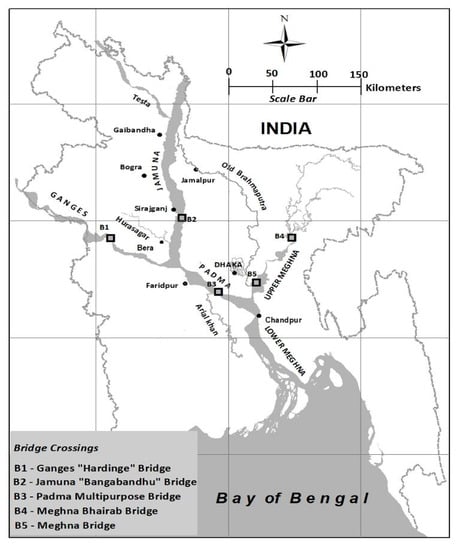 - Sarker, M.H.; Klaassen, G.J.; Noor, F.; Islam, M.S. Impact of the Bangabandhu Bridge on the Morphology of the Jamuna River, Bangladesh. In Proceedings of the 3rd International Conference on Water & Flood Management (ICWFM-2011), Dhaka, Bangladesh, 8–11 January 2011. [Google Scholar]