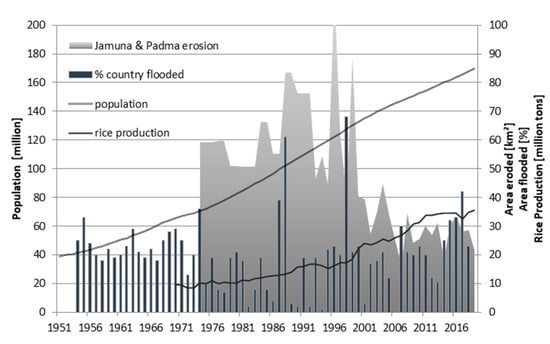 The natural environment of Bangladesh expressed in area flooded (in percentage of Bangladesh) and eroded land along the Jamuna and Padma Rivers (in km2) compared with the population growth and annual rice production (in million metric tons) (data source: CEGIS).