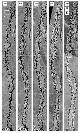 The Jamuna River is the single most significant cause of natural hazards. This is largely because the Jamuna River has been widening. This widening is a consequence of the Great Assam Earthquake in 1950, which dislodged some 45 billion cubic meters of sediment from the eastern Himalayan mountain slopes [,]. In Bangladesh, this sediment overloading triggered an increase in the average width of the Jamuna from 8 to 12 km, while the Padma River widened from 6.5 to nearly 11 km from the 1970s to the 2010s. During this period, the Jamuna turned into a braided river; however, it still had some meandering and anabranched reaches as recently as the mid-1980s (Figure 3). The braided characteristic is strongly associated with ever-changing channel patterns, which result in several thousand hectares of annual erosion. Local erosion eats laterally into the floodplain by as much as 1 km in one season. The extent and location of riverbank erosion along the Jamuna can be reasonably predicted only one year in advance []. The Padma River, despite being more powerful, is more predictable. This is because some of its banks consist of more erosion-resistant clay, making its planform swing between anabranched and meandering at a slower, more predictable pace. Since the mid-1990s, the annual average erosion rates along the Jamuna and Padma Rivers have halved from approximately 6300 ha (from 1973 to 1997) to approximately 3300 ha (thereafter until 2019) (Figure 3). The Ganges River, being a meandering river, is also more predictable. Downstream, the Lower Meghna debouches the combined flow of the Ganges, Jamuna, and Upper Meghna into the Bay of Bengal. The Lower Meghna (as well as the Upper Meghna during the dry season) is tidal and its length is almost entirely part of the estuary.