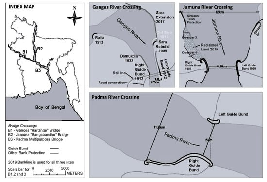 Major river training work for bridge engineering is limited to three locations on the Ganges, Jamuna and Padma Rivers in Bangladesh (Figure 4). (There are two more bridge crossings over main rivers, namely the Upper Meghna, at Bhairab, consisting of a railway bridge completed in 1937 and a road bridge completed in 2002; and two road bridges near Dhaka most popularly known as the Meghna Bridge and the second Meghna Bridge, completed in 1991 and 2019. However, these bridges are of less significance in river engineering terms due to the comparatively stable river characteristics.) The Hardinge Bridge crosses the Lower Ganges at Sara. It was constructed between 1909 and 1914 [,], with a road bridge added downstream during the first years of the 21st century. The Jamuna Multipurpose or Bangabandhu Bridge crosses the Jamuna downstream of Sirajganj. It was constructed between 1996 and 1998 [], with an upstream railway bridge now being planned some 20 years after the bridge inauguration. The Padma Multipurpose Bridge crosses the Padma River near Mawa []. Its construction started in 2014, with the bridge expected to be opened in the early 2020s.