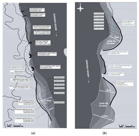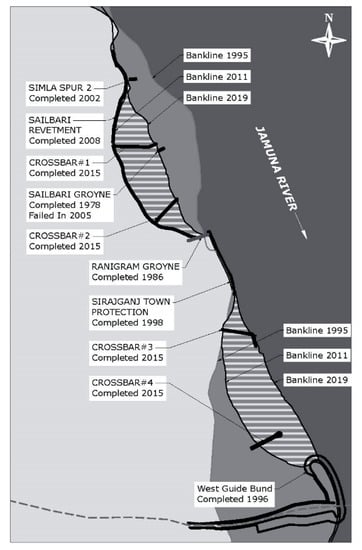 Acknowledging the population increase during the early 1950, shortly after independence, the UNDP (“Krug Mission”) identified the need for systematic flood protection to provide more controlled conditions for higher yielding rice varieties, especially in the Northwestern portion of the country (the “bread basket of Bangladesh”). This resulted in a massive embankment construction program starting with the Brahmaputra Right Embankment from the mid-1960s []. The embankment runs over some 175 km from the Teesta to the Hurashagar rivers along the right bank. During the 1980s embankments from the Hurashagar to the Ganges and from the Teesta to the north at Kurigram were built, completely embanking the approximately 250 km long right bank. These embankments came under increasing erosional threat and had to be reconstructed in places multiple times. Over time, the embankment line lost more and more of its set-back distance. In the most erosion prone reach, the set-back distance reduced from 1300 m in the early 1970s to 650 m in the mid-1990s, and finally to 350 m in 2014 []. The remaining setback distance is coming close to the annual average erosion rate. The high number of embankment breaches highlighted the need for an economic solution for protecting longer stretches of riverbank.
