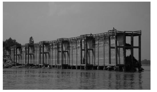 The first large infrastructure projects in Bangladesh date from the British colonial period. The development of a comprehensive railway network in British India from the mid-19th century onwards resulted in the development of a large number of river crossings (as well as changes in the flood and drainage patterns through the high and long lateral embankments constructed for railway lines). Bridge crossings were based on two principles published in the late 19th century [,]. First, abutments were stabilized with “Bell bunds”, later named “guide banks” or “guide bunds”. The second principle relates to the placement of “armor stone” along the riverbed, termed the “apron”. All bridge crossings in Bangladesh depend on aprons, while many have guide bunds.