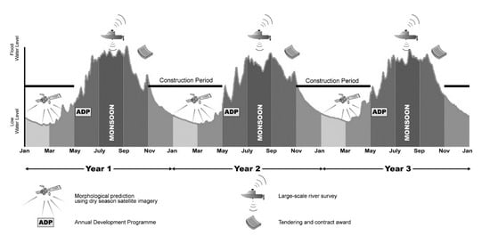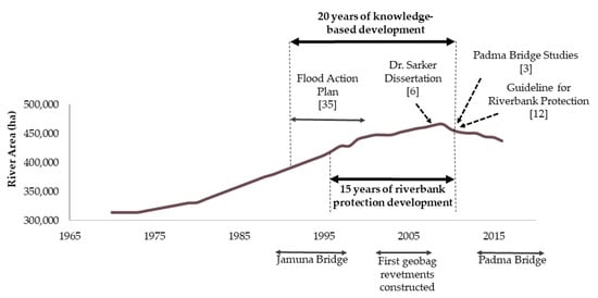 After two successive record floods in 1987 and 1988, the Government took up the Flood Action Plan (FAP) coordinated by the World Bank. The 26 components looked at the systematic development of the water resources in Bangladesh, such as riverbank protection and river training [,,]. Significantly, some of the initiators recognized the need for piloting different options to arrive at work suitable for the difficult conditions in the main rivers, as well as the importance of monitoring the river.