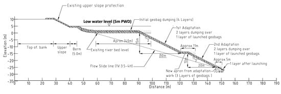 This article summarizes the authors’ experience with riverbank protection and river training works gained over the last two and a half decades in Bangladesh. This article also provides lessons learned. The authors contributed to the analysis of existing work in 2000 [], the development of sand-filled geotextile bag (geobag) revetments from 2001 until 2008 [,], the design of the river training works for Padma Bridge from 2009 until 2011 [], the implementation of the Flood and Riverbank Erosion Risk Management Program from 2015 until 2020 [,], and the preparation of a “river stabilization plan” []. Experience with river training is summarized in Chapter 2. Chapter 3 focusses on riverbank protection, concentrating on the most relevant experience over the last 25 years. Finally, Chapter 4 summarizes key experiences and lessons learned.