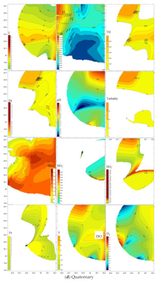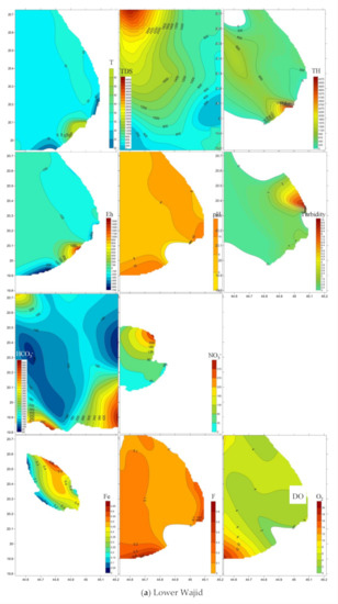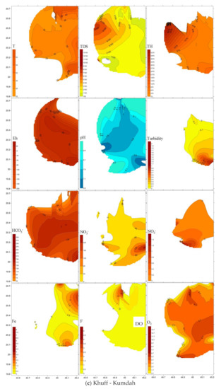 Spatial distribution of pollutants is shown on Figure 5 where sampling points are present in the three-dimensional space. Plumes of elevated values are marked brown to red tints. TDS and total hardness plumes occur in the north western area of the four-water bearing formations. Nitrate (NO3−) was largest in the north in the Lower and Upper Wajid, and in the eastern downstream area for the Khuff and the Quaternary aquifers. Plumes of the other pollutants varied in their occurrence places within the aquifers.