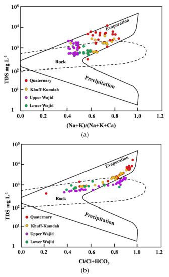 In order to highlight the major mechanisms controlling groundwater chemistry and the dominated hydrogeochemical facies of the study area, the Gibbs diagram [28], as exhibited between TDS vs. Na+/(Na+ + Ca2+) and Cl−/(Cl− + HCO−3), was used and clarified the dominance of the water–rock interaction and evaporation processes (Figure 6), primarily controlled by the chemical composition of recharge waters, water–aquifer matrix interaction, and groundwater residence time [49,50]. Vertical distribution of groundwater quality within the multi-layered aquifer showed pronounced zonation, in particular for the salinization. Water–rock interaction processes dominate at large depths (e.g., Lower and Upper Wajid) and the evaporation dominates at shallower depths (e.g., Quaternary) underpinned by the upward increase of the recharge inputs from waters influenced by intensive evaporation. Khuff-Kumdah aquifer clarified the combined dominance of the water–rock interaction and the evaporation processes.