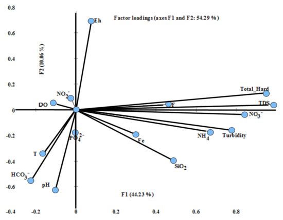 Contributions of quality parameters to groundwater data variances plotted on the loading space of primary factor (F1) versus (F2).