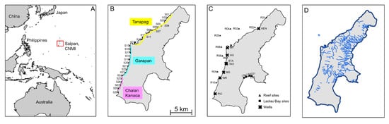 - Okano, D.; Okano, R. A Preliminary Investigation of Groundwater and Surface Water Impacts on Newarshore Biological Communities in Saipan Lagoon; CNMI Watershed Working Group: 2016; p. 27. Available online: https://dcrm.gov.mp/wp-content/uploads/crm/2016.7.20_WWG-meeting_OkanoOkano_SaipanLagoon.pdf (accessed on 29 September 2020).