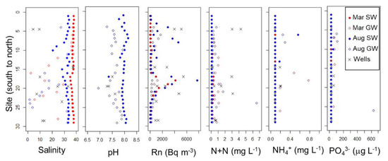 In August (rainy season) only, three sites did not conform to the general inverse linear trend between salinity and Rn. These outliers were Sites 9, 10, and 15. Sites 9 and 10 are located near the outlets of intermittent streams (Figure 1) which are more likely to flow during the rainy season. This would contribute fresh water to the lagoon in those regions, thus accounting for the decrease in salinity not accompanied by elevated Rn. Site 15 is near Tanapag Harbor, American Memorial Park, and a constructed wetland discharge channel [25], although it is unknown whether the channel discharges seasonally.