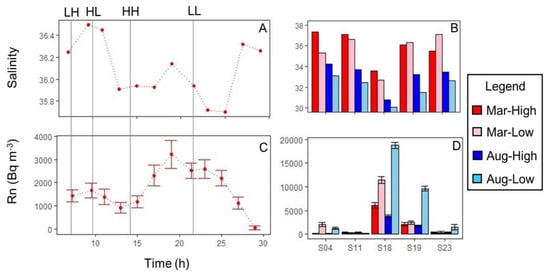 Tidal variability in surface water salinity (A,B) and Rn (C,D). Abbreviations for different parts of Saipan’s mixed semidiurnal tidal cycle: LH = low high tide, HL=high low tide, HH = high high tide, LL = low low tide. Panels A and C show data from S21, where samples were collected every 2 h for 24 h in March 2018. Panels B and D show data from 5 other sites sampled at high and low tide during both trips. Error bars indicate analytical uncertainty of Rn measurements.