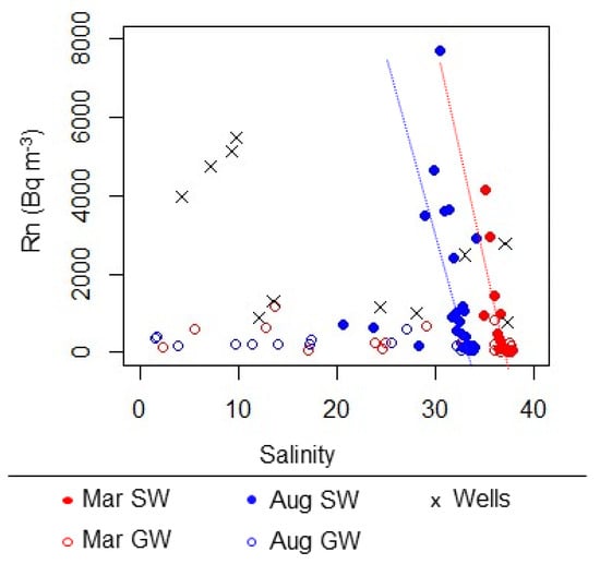 In shoreline surface water samples and wells, salinity and radon concentrations showed a strong inverse correlation within each sampling campaign (Figure 4). In surface water at all sites, salinity was notably lower during the August sampling campaign, which took place during the rainy season (Figure 2). Maximum groundwater salinity values were also lower in August, but minimum groundwater salinity values were similar (Figure 2). Additionally, samples with comparable Rn activities between the two sampling campaigns had lower salinity in August compared to March (Figure 4).