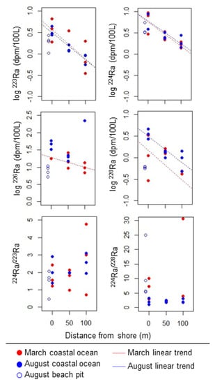 Variation in Ra isotope activities and activity ratios along 100 m shore-perpendicular transects during both trips. No linear trend is shown when there was no significant relationship with distance from shore.