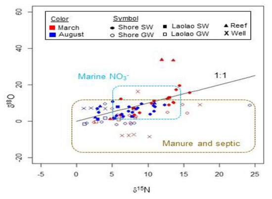In surface and groundwater samples, δ15N and δ18O values were consistent with a manure or septic NO3− source, as well as some mixing with marine and/or atmospheric NO3− (Figure 6). Samples generally fell along a 1:1 line, although considerable scatter occurred. δ15N values in surface and groundwater fell between 1.4 and 24.3. They were lower in August than in March in both surface and groundwater, although the ranges overlapped. No distinct spatial variability in δ15N of dissolved NO3− was observed (Figure 7A).