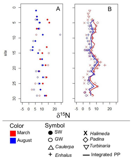 Integrated primary producer δ15N showed a pattern of spatial variability that was remarkably consistent between March and August (Figure 7B), although August values were slightly lower. The pattern included an area of elevated primary producer δ15N centered around S18 and a smaller peak centered around S26. The difference between March and August primary producer δ15N was largest between S4 and S7.