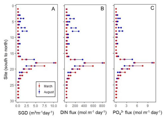 SGD-associated total DIN flux into the lagoon system was higher in August (1500–3000 mol N day−1) than March (1200–2300 mol N day−1). DIN flux was greatest in Garapan Lagoon (1100–2200 and 1000–2000 mol N day−1 in March and August, respectively). Tanapag Lagoon had a significant but lower SGD-derived DIN input in August (480–960 mol day−1). PO43− followed similar trends (Table 5, Figure 8).