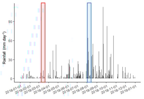 Daily rainfall measured at the Saipan airport during calendar year 2018. Approximate duration of the March and August sampling campaigns are shown as red and blue boxes, respectively. Dates are given in YYYY-MM-DD format.