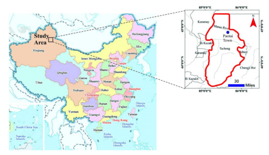 The geographical location of Xinjiang in China and the experimental station at Paotai Town in Xinjiang.