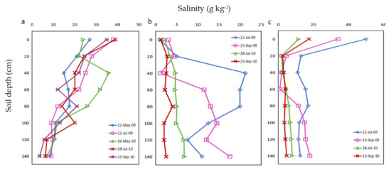 Distribution of soil salinity during 2009–2010 in field 2: (a) uncultivated land; (b) under mulch; and (c) in the bare area outside the mulch.