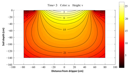 To ascertain the relationship between salt content under mulch and bare area, and to trace the origin of salt content in the bare area, we simulated the migration of soil salt using MATLAB on the basis of the Richards equation [21].