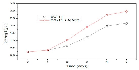 Biomass changes of Chlorella vulgaris and C. vulgaris–Enterobacter sp. MN17 consortium in BG-11 media.