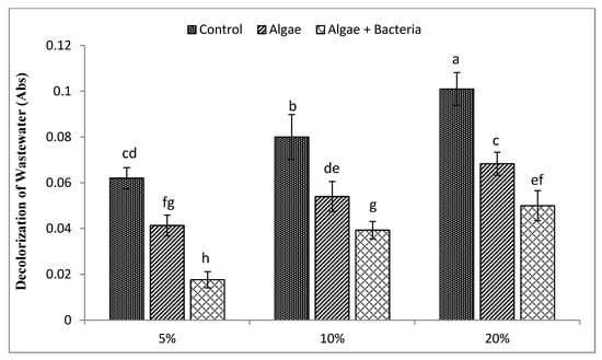 Efficiency of algae and algal–bacterial consortium for decolorization of textile industry wastewater with respect to their control values at different dilution levels. Columns show mean values and bars show standard deviation (SD) of means. All means followed by different letters were significantly different according to Tukey HSD (honestly significant difference) test at p < 0.05.
