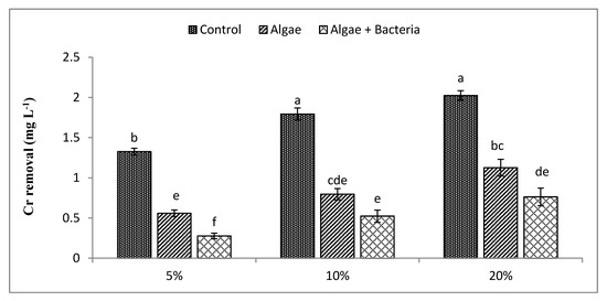 Efficiency of algae and algal–bacterial consortium for chromium removal from textile industry wastewater. Column shows mean values, and bars shows standard deviations (SD) of means. All means followed by different letters were significantly different according to Tukey HSD test at p < 0.05.