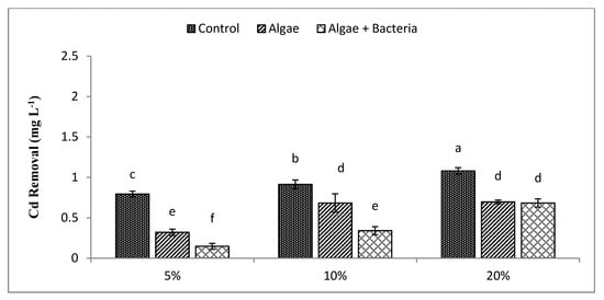 The removal of Cr, Cd, Cu, and Pb by C. vulgaris was individually compared to the consortium of C. vulgaris and Enterobacter sp. MN17 from initial concentrations with their removal efficiencies in (Table 1). The highest concentrations were found for Cu followed by Cr, Pb, and Cd in all three dilutions. Removal efficiency of Cr (Figure 3) was 58%, 56%, and 44%, respectively, by algae, while RE by the algal–bacterial consortium for Cr was 79%, 71%, and 62% at 5%, 10%, and 20% dilutions, respectively. Algae removed Cd at all dilutions. Cd (Figure 4) removal by algae at 5% dilution ranged from 0.79 mg L−1 to 0.32 mg L−1 (RE 59%), at 10% dilution Cd decreased from 0.91 mg L−1 to 0.68 mg L−1 (RE 25%), and at 20% dilution level Cd decreased from 1.08 mg L−1 to 0.69 mg L−1 (RE 36%). The algal–bacterial consortium showed better results for Cd treatment with an RE of 93%, 53%, and 36% at 5%, 10%, and 20% dilutions, respectively, over other studied metals.