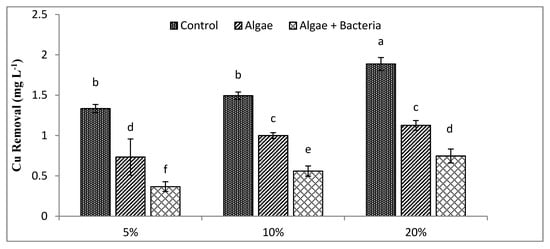 Efficiency of algae and algal–bacterial consortium for copper removal from textile industry wastewater at different dilution levels. Columns show mean values, and bars show standard deviation (SD) of means. All means followed by different letters were significantly different according to Tukey HSD test at p < 0.05.