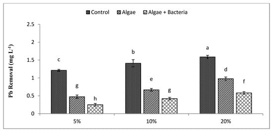 Efficiency of algae and algal–bacterial consortium for lead removal from textile industry wastewater at different dilution levels. Column shows mean values, and bars shows standard deviation (SD) of means. All means followed by different letters were significantly different according to Tukey HSD test at p < 0.05.