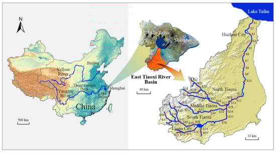 As shown in Figure 1, the Yangtze River originates from glaciers on the Qinghai–Tibet Plateau at its westernmost point, heads toward the East China Sea and eventually enters the Pacific Ocean. Along the way, it flows across the southwestern and central parts of China before reaching its outlet in Shanghai (the economic centre of the country). With a length of 6300 km and a catchment area of 1.8 million km2, the Yangtze River is the third largest river in the world. Having the biggest discharge volume, it also supports the world’s largest hydroelectric power station, i.e., the Three Gorges Dam. Designated as part of the latest national development strategies, the Yangtze River Economic Belt includes about 40% of the country’s population and aggregate economy and is on the way of high-speed development. In its development planning outline issued in 2016, “ecology first” and “green development” form basic principles. Unfortunately, the Yangtze River Basin had long been sustaining extremely severe destruction of aquatic habitats [8]. In a multi-year study undertaken by the China Europe Water Platform (CEWP) project, a China–Austria cooperating project, etc., representative tributaries of the lower basin of the Yangtze River were thoroughly and continuously investigated. The main study area was the East Tiaoxi River Basin, one of the best epitomes of the environmental issues of the Yangtze River Basin (Figure 1). With a mainstream length of 152 km and a catchment area of 2267 km2, the East Tiaoxi River is the largest river flowing into Lake Taihu, the third largest freshwater lake in the Yangtze River Basin. This lake with scenic beauty has been drawing focuses of worldwide researchers, ironically due to its notorious chronic water pollution problems such as eutrophication [9].