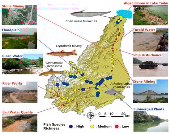 The number and biodiversity of fish are the most significant indicators of the health of a waterbody. In China, there are more than 1100 species of freshwater fish, 70% of which inhabit the rivers [1,2]. Although the total number is notable among worldwide statistics, the biodiversity has been continuously declining with increasing anthropogenic and economic development. In fact, as early as 1998, 92 species of the freshwater fish were listed in the China Red Data Book of Endangered Animals: Pisces [3], which shows that four species unfortunately have gone extinct and 28 species have become endangered. The loss of biodiversity greatly exceeds the world average [4]. It is the adverse anthropogenic impacts on the freshwater ecosystem that must first be to blame. Both notorious industrialisation and urbanisation are major hindrances to sustainable development in China. Against the background of abrupt population expansion, many irrational activities associated with urbanisation have led to deterioration of the aquatic environment, such as unsustainable exploitation of water resources, improper river modification, pollutant discharge and exotic species invasion.