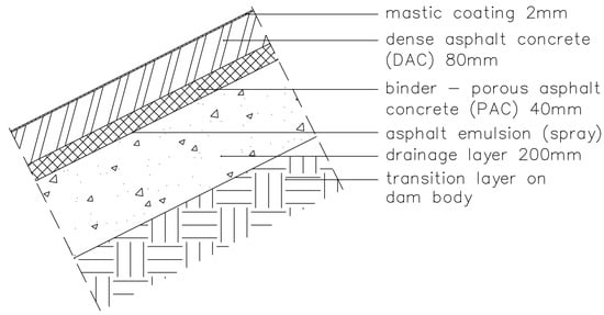 The lining is composed of layers in the manner shown in Figure 1. The dense asphaltic concrete (DAC) is about 80 mm thick, while the thickness of the underlying binder—a porous asphaltic concrete (PAC) layer—varies from 40 to 80 mm. It is composed from greywacke aggregates connected with an asphalt binder, sand, and pulverized limestone filler. The drainage layer (200 mm) lies upon the transition layer of the dam body. The upper face of the dense layer has been coated with an approx. 2 mm-thick mastic layer composed of asphalt (30%) and a limestone filler (70%). An asphalt emulsion spray covers the drainage layer.