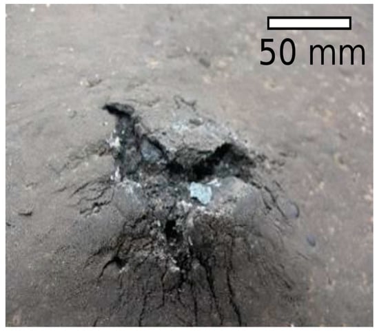 The defects in the ACL were manifested by the creation of local closed and open blisters. Two of the studied open blisters looked like burst pustules with a diameter of around 150 mm and a height of between 30 and 50 mm with an open crack (Figure 2). Inside the blisters there was a cavity with a depth of between 30 and 80 mm, which was filled with water and the crumbled components of the asphalt concrete (asphalt, asphalt with mastic remnants, and aggregates).